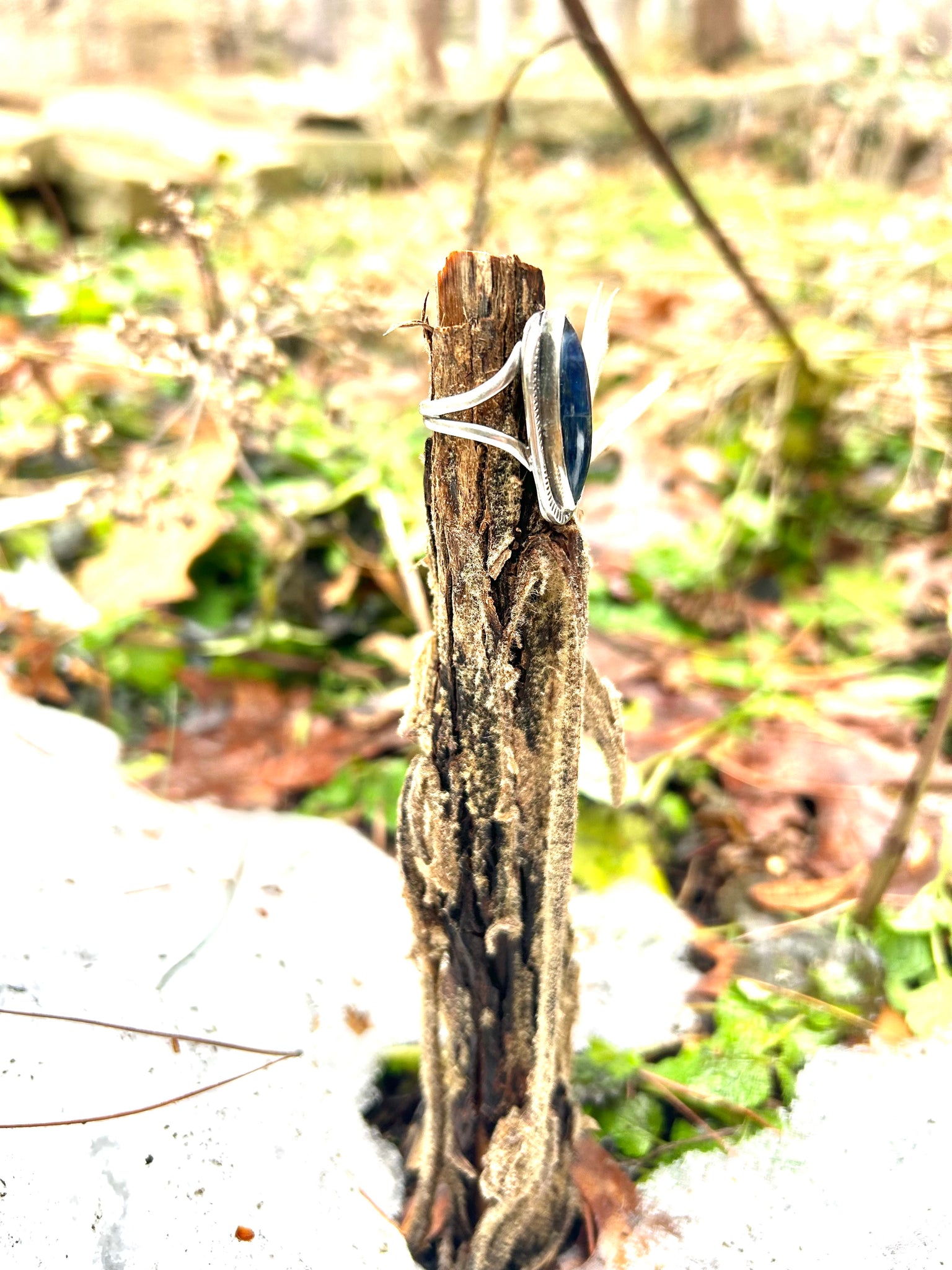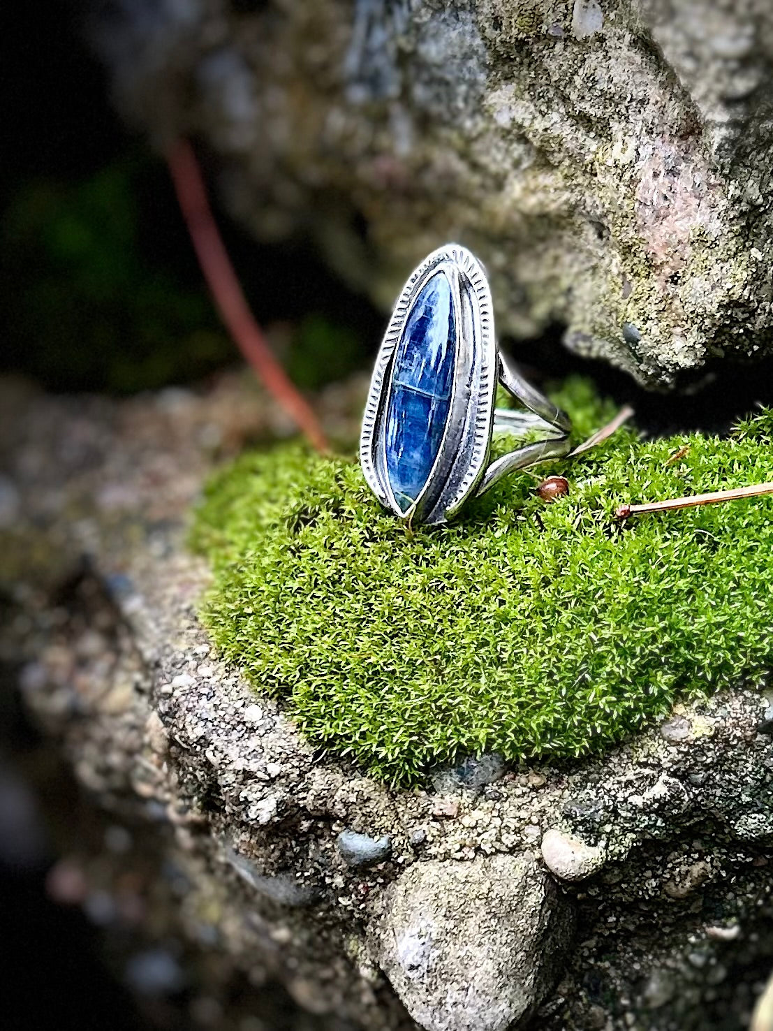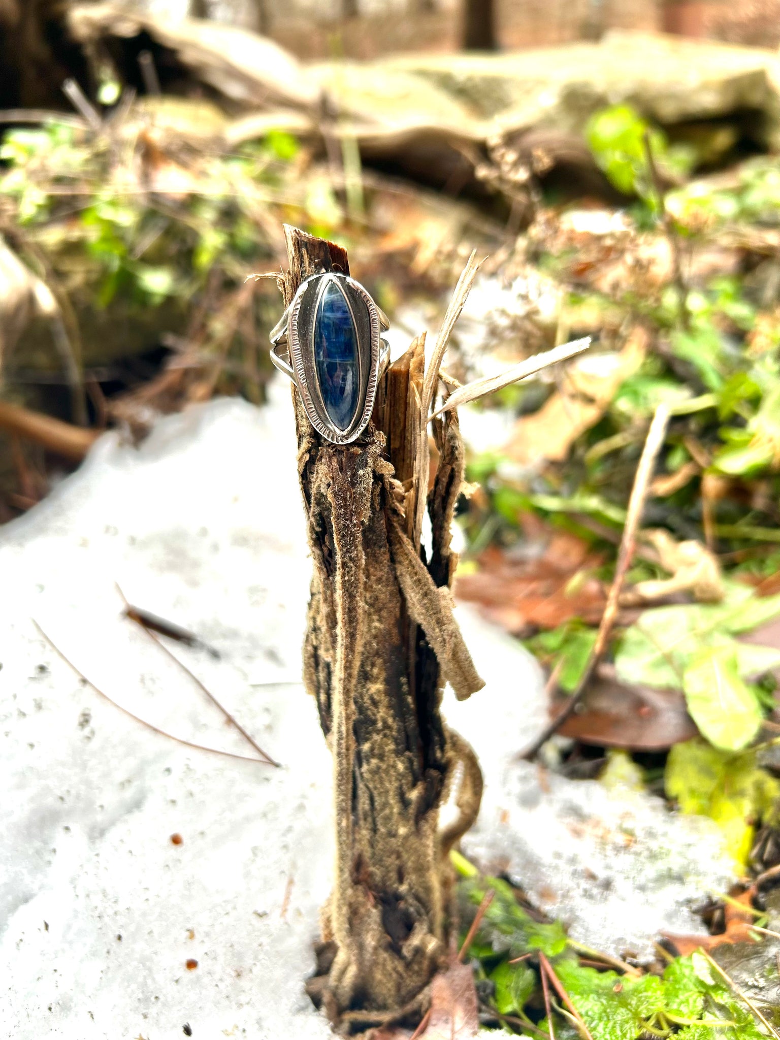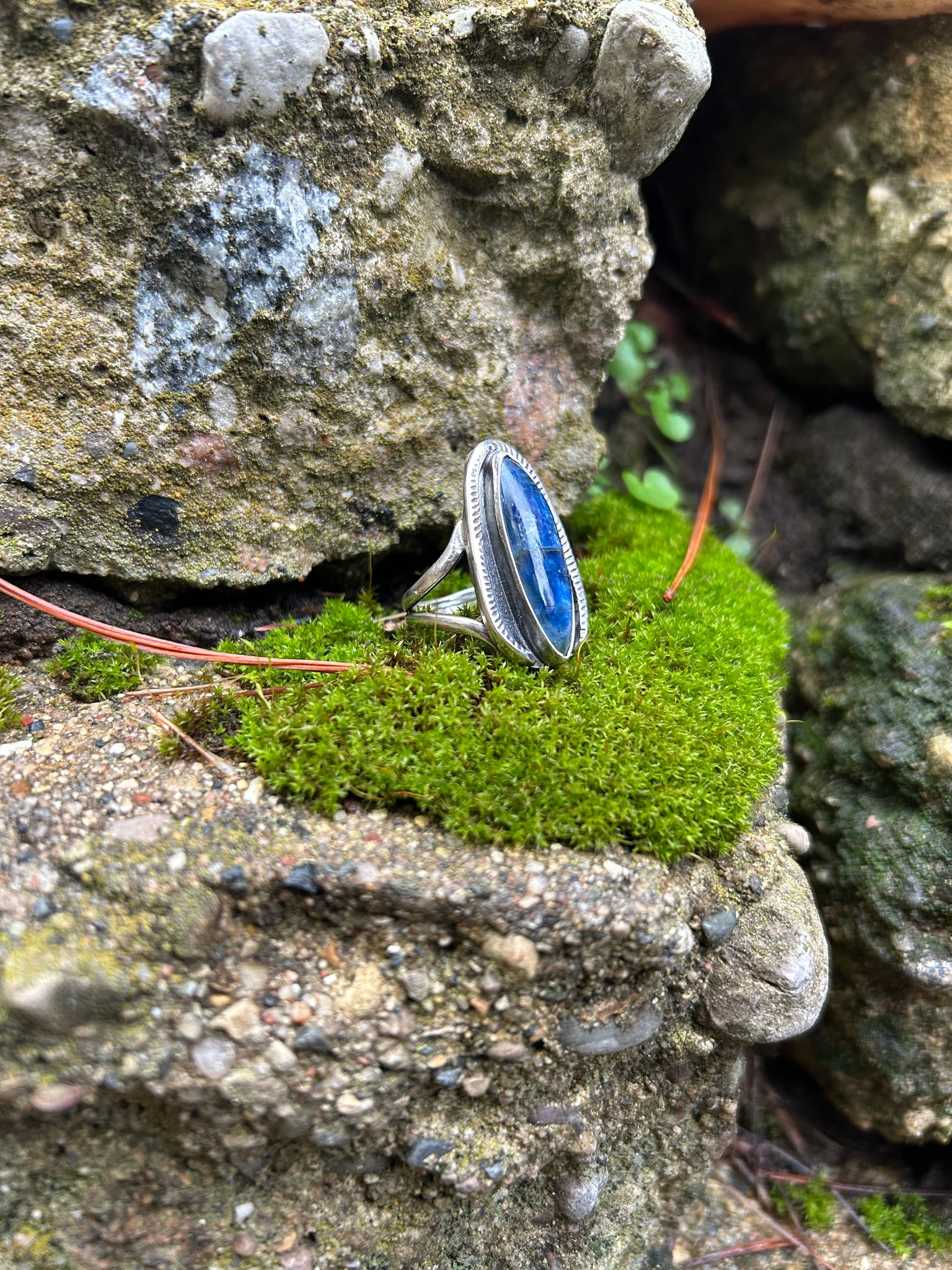 one of a kind sterling silver ring with polished blue kyanite gemstone