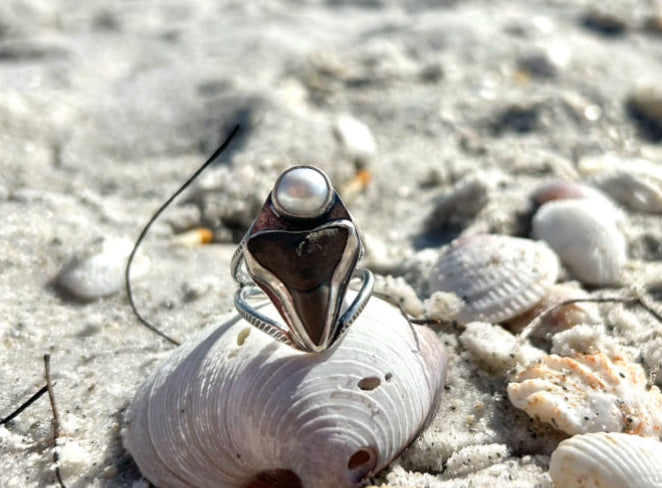 One of a kind shark tooth fossil and fresh water pearl set on sterling silver ring