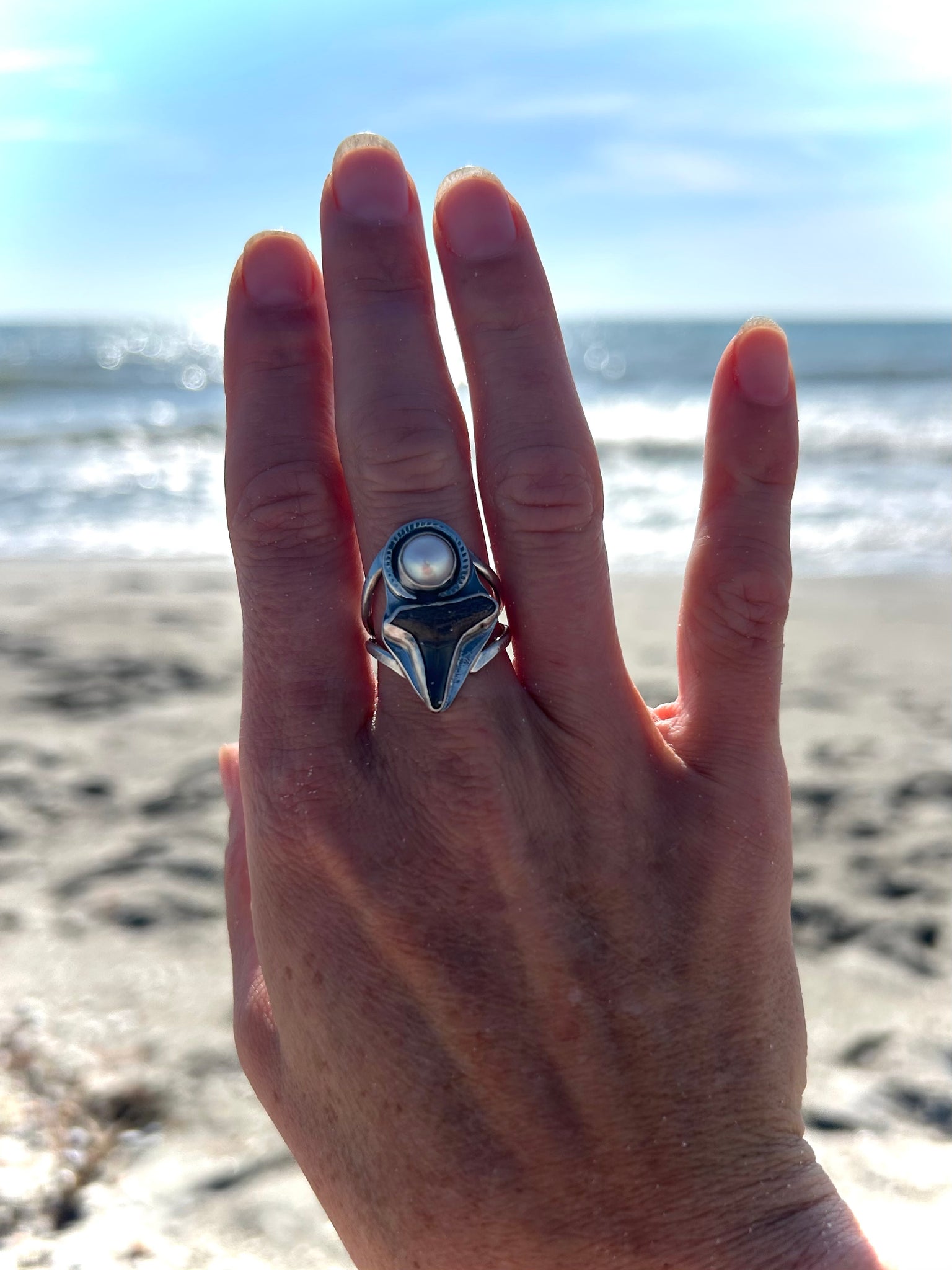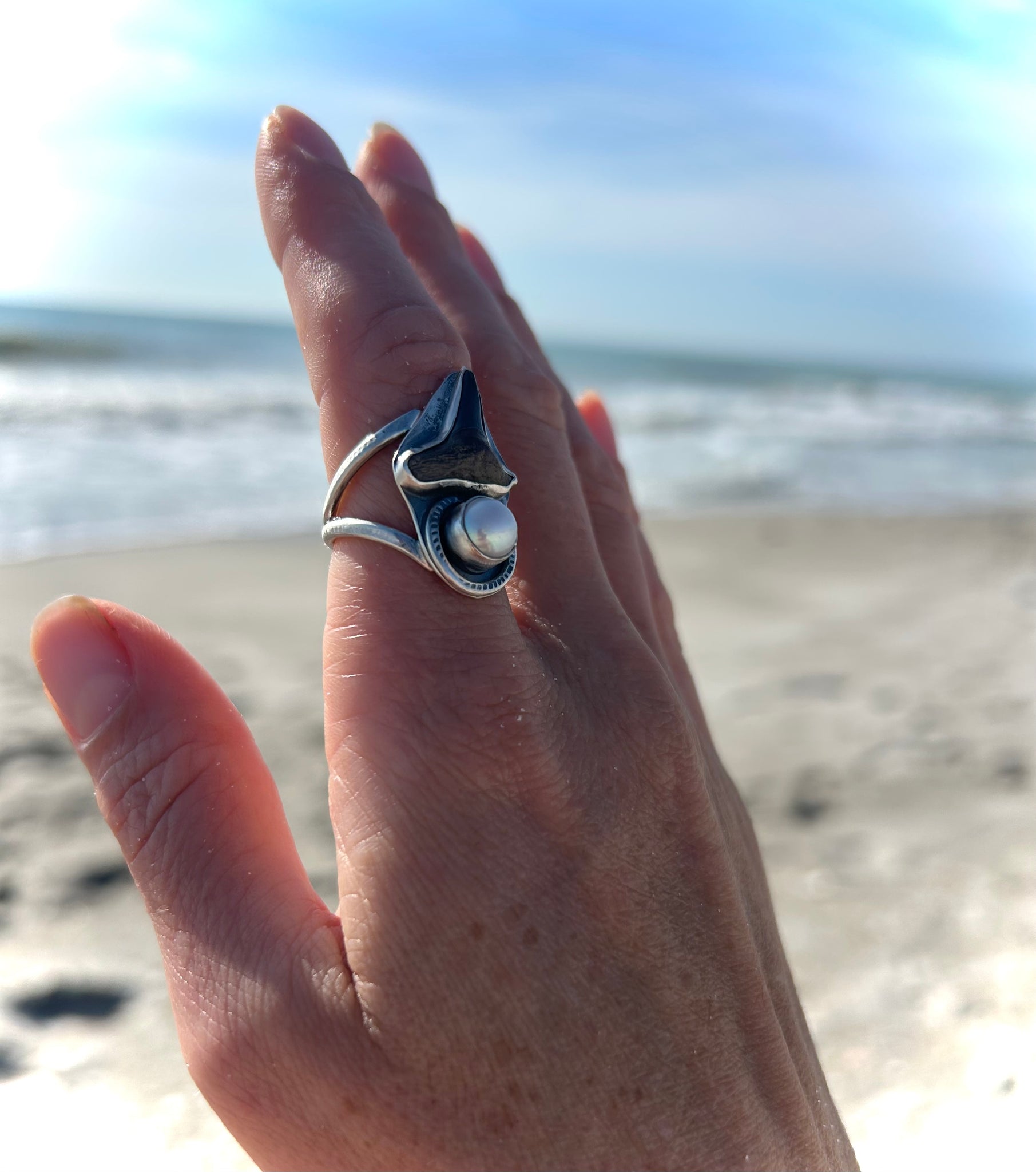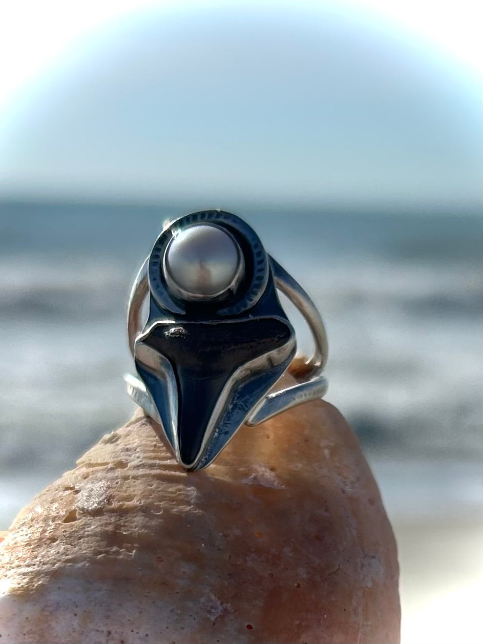 One of a kind shark tooth fossil and fresh water pearl set in sterling silver ring