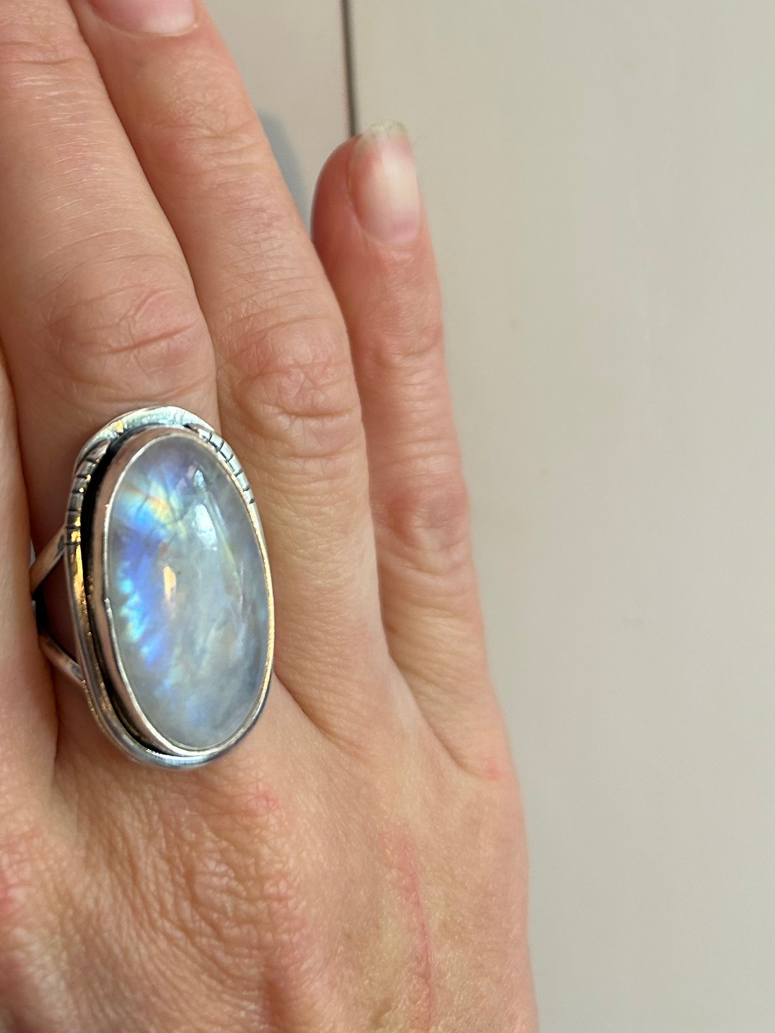 Rainbow Moonstone set in one of kind sterling silver ring