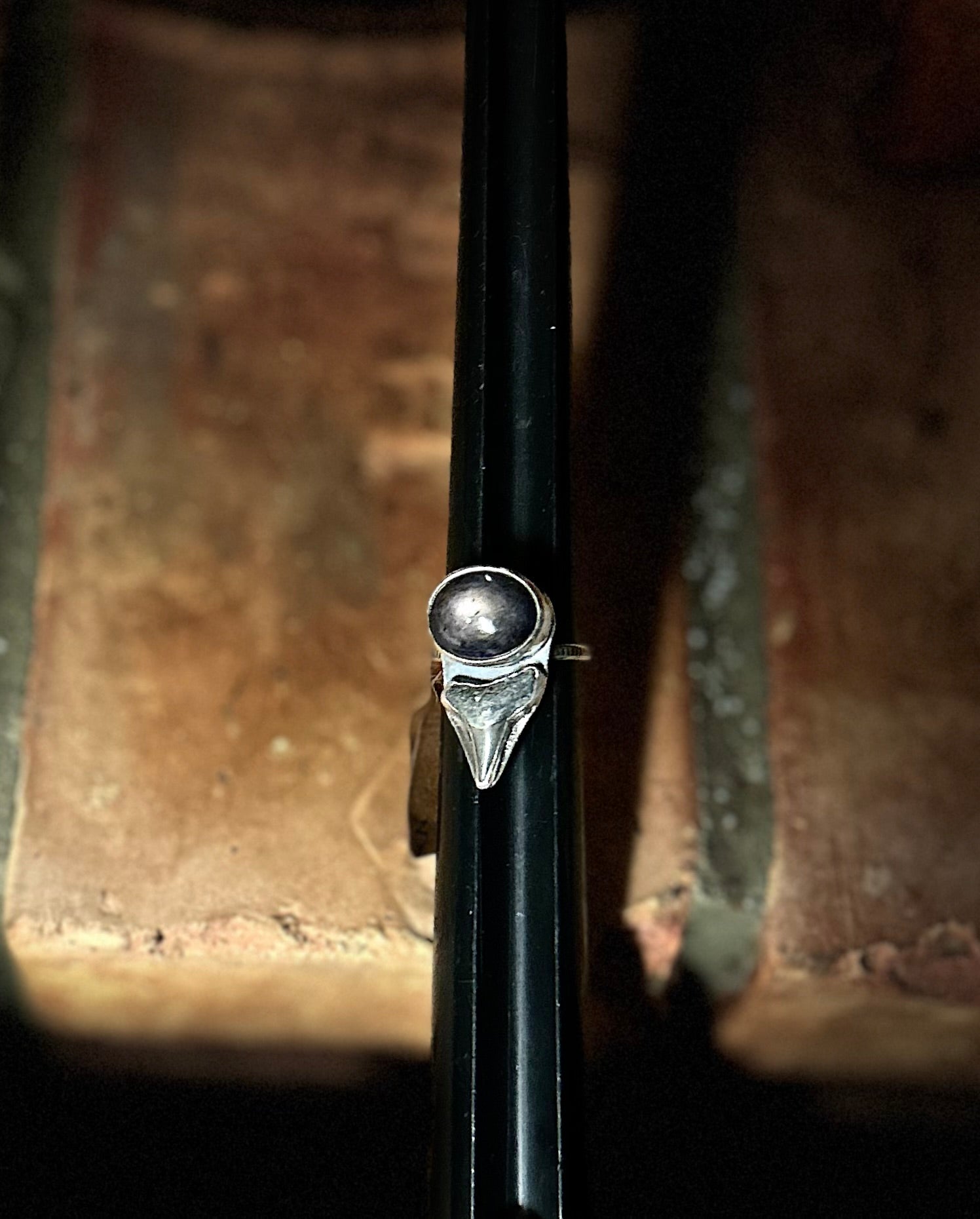 Star sapphire gemstone paired with shark tooth set in one of king sterling silver ring