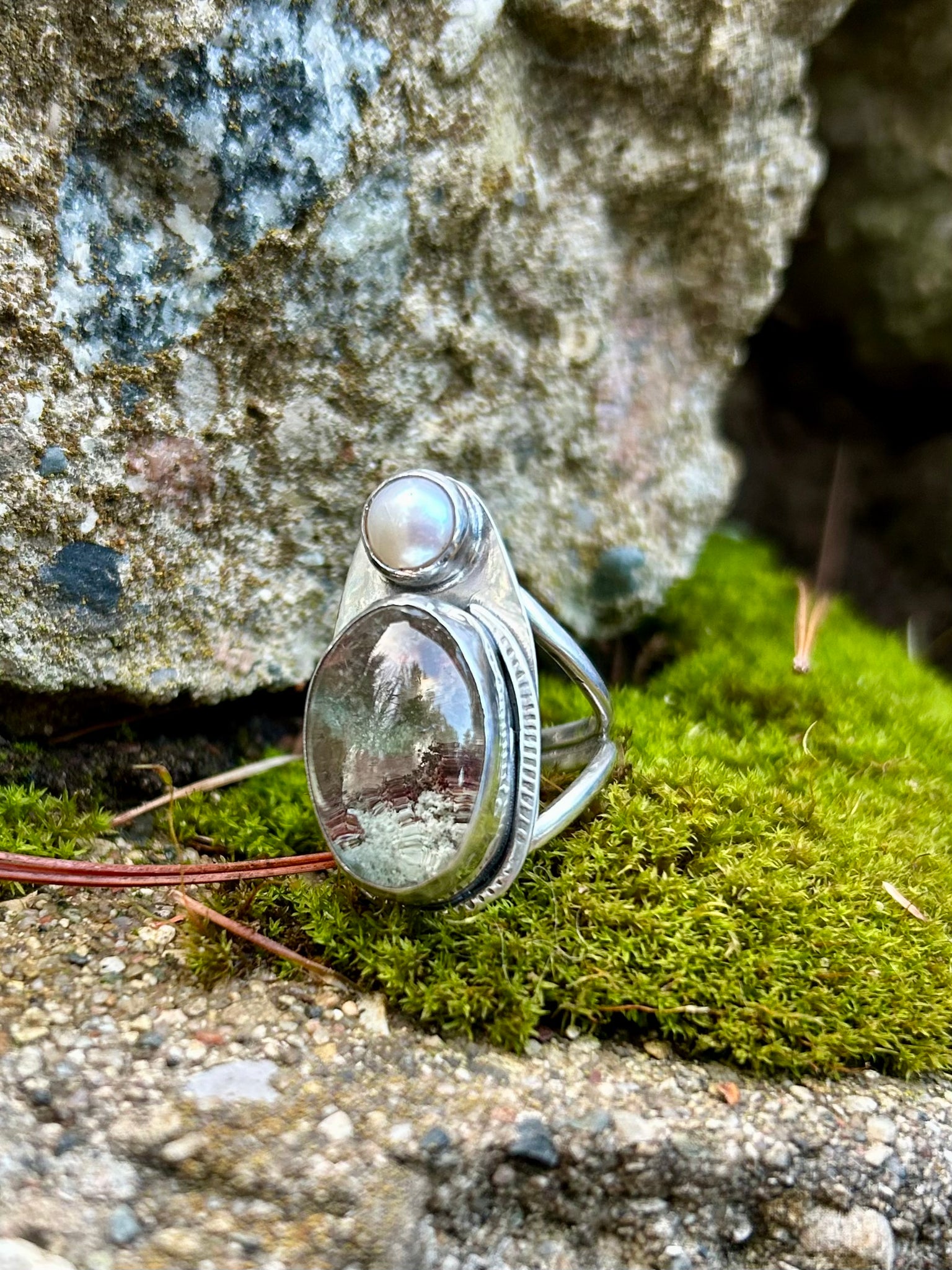 Shamanic dream quartz also know as Lodolite set in one of kind sterling silver ring with fresh water pearl