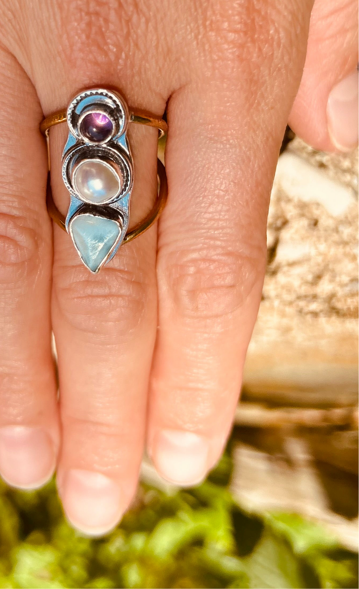 One of a kind trio of amethyst, freshwater pearl and Larimar set in sterling silver with brass band