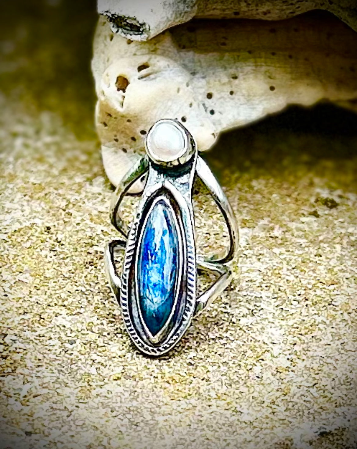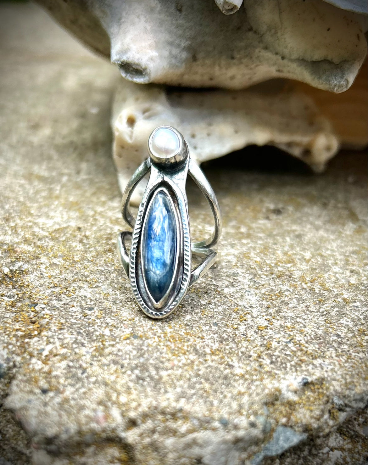 One of a kind fresh water pearl + blue kyanite gems set in sterling silver ring band