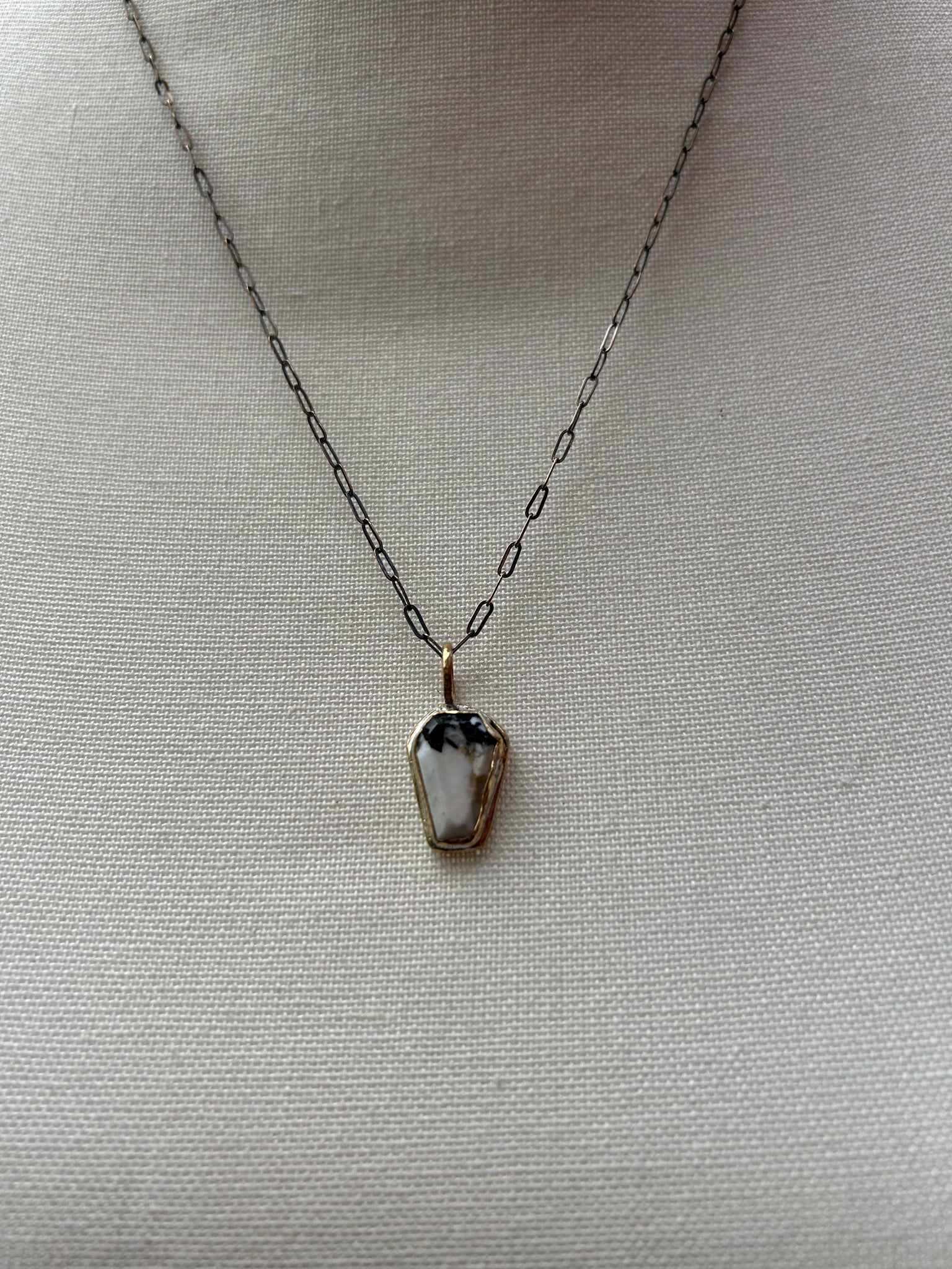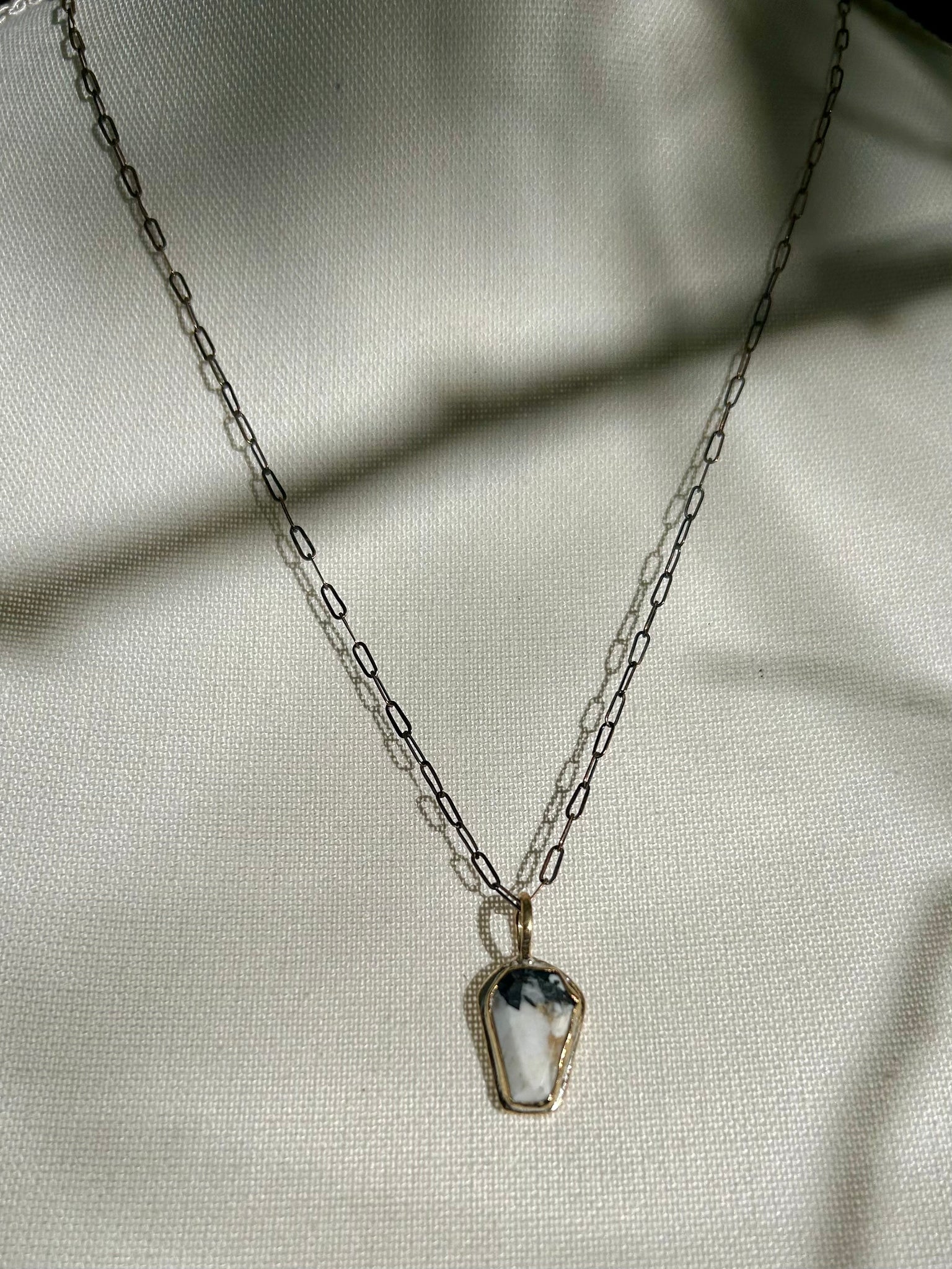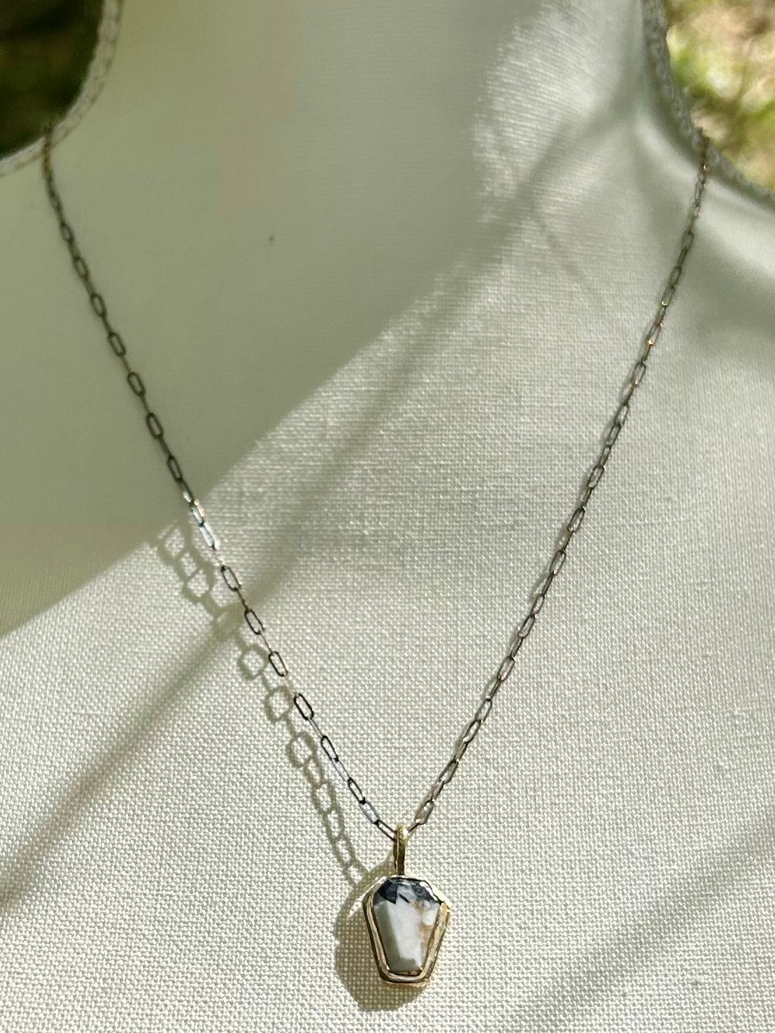 one of a kind natural white buffalo coffin shape gemstone set in brass pendant with brass chain
