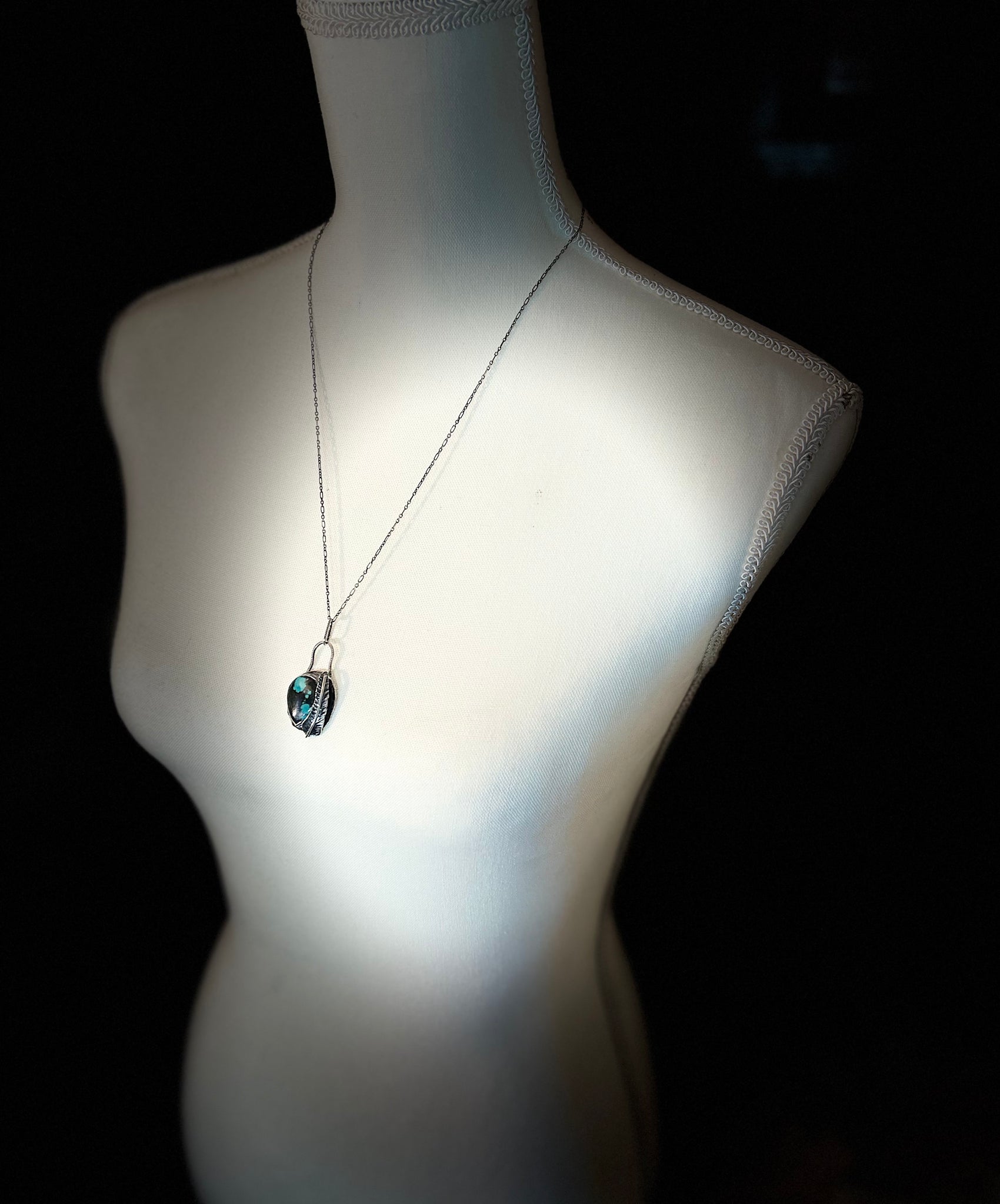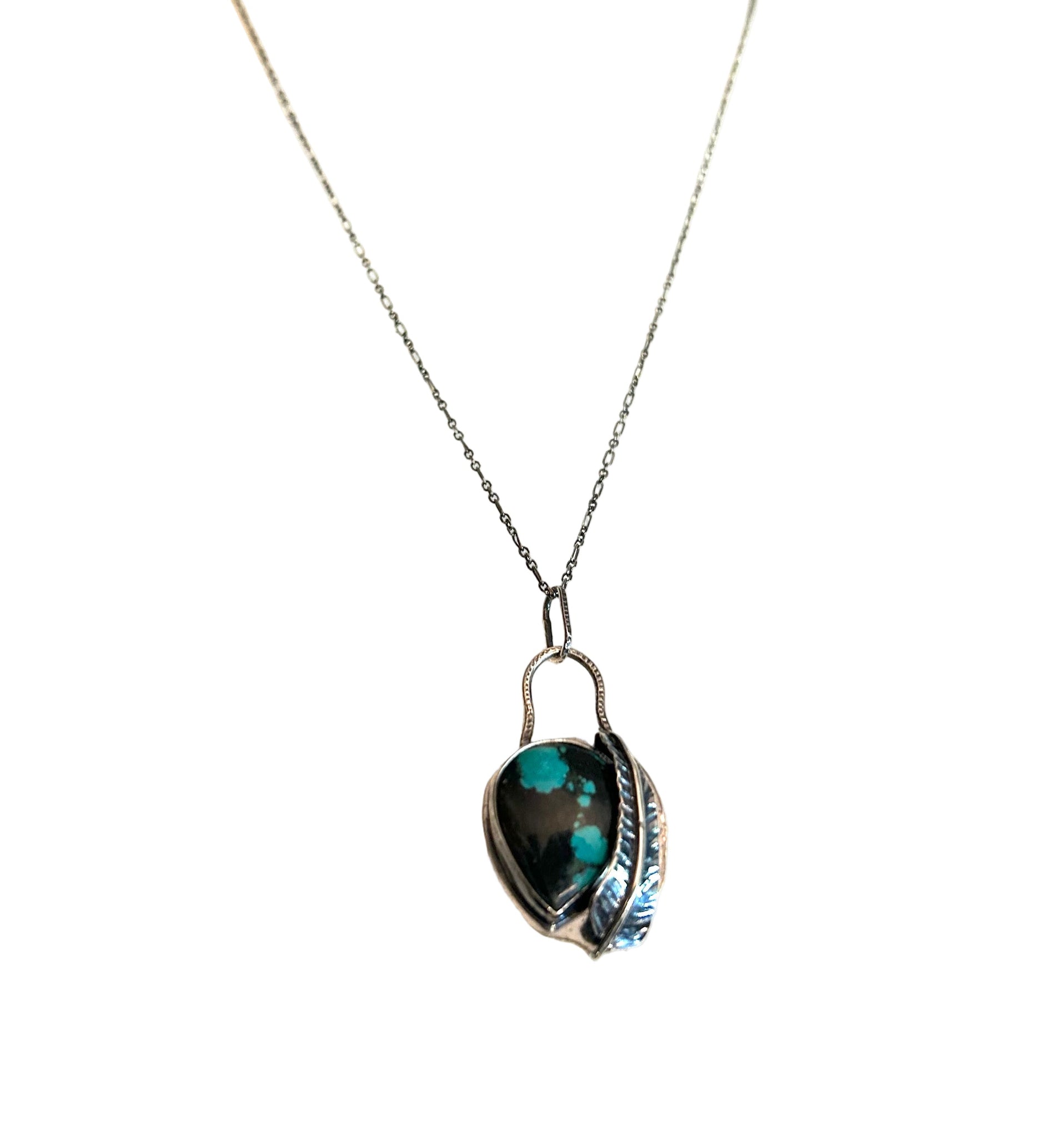 Hubei Turquoise set in one of a kind sterling silver talisman with 24 inch sterling silver chain