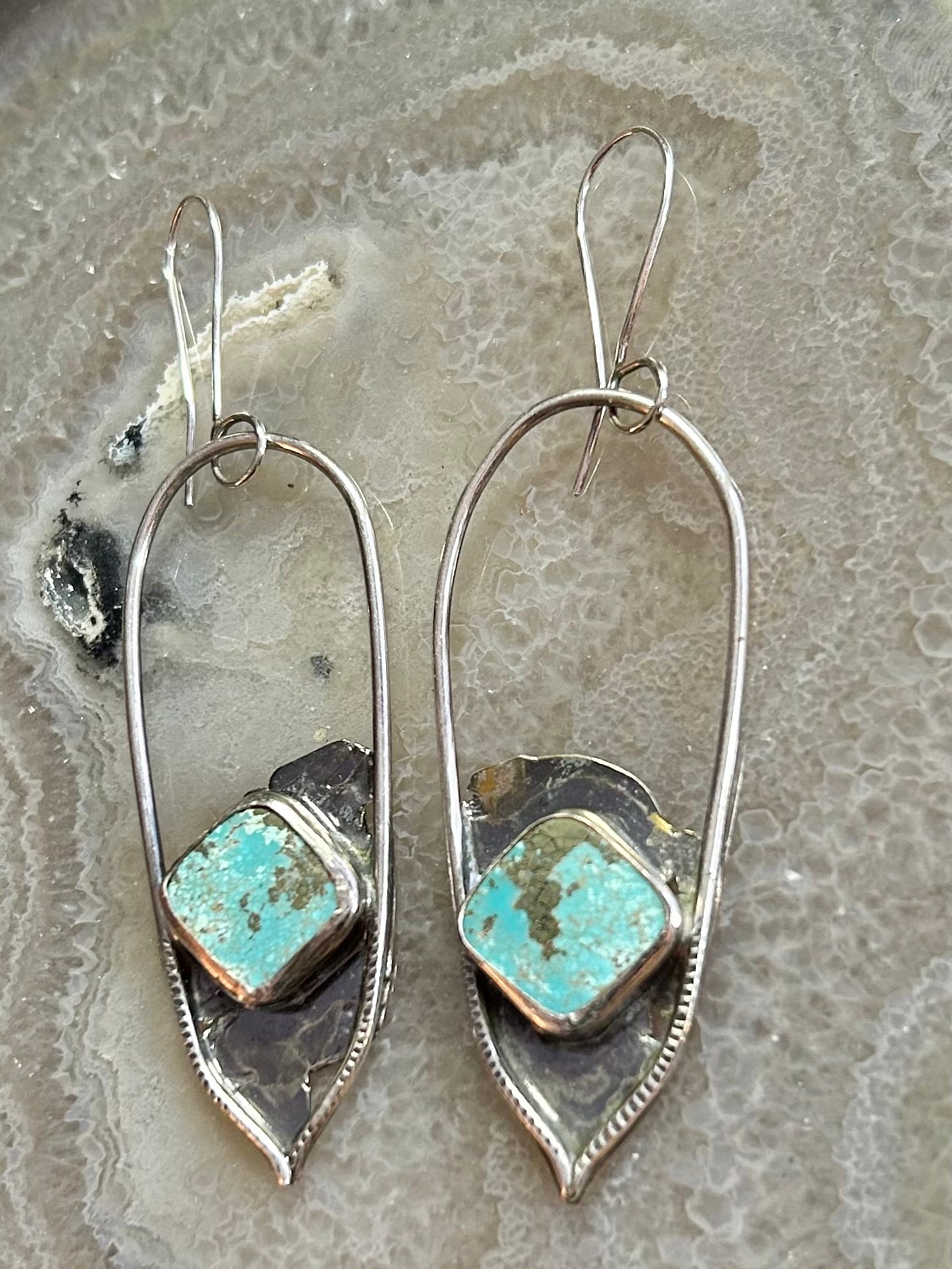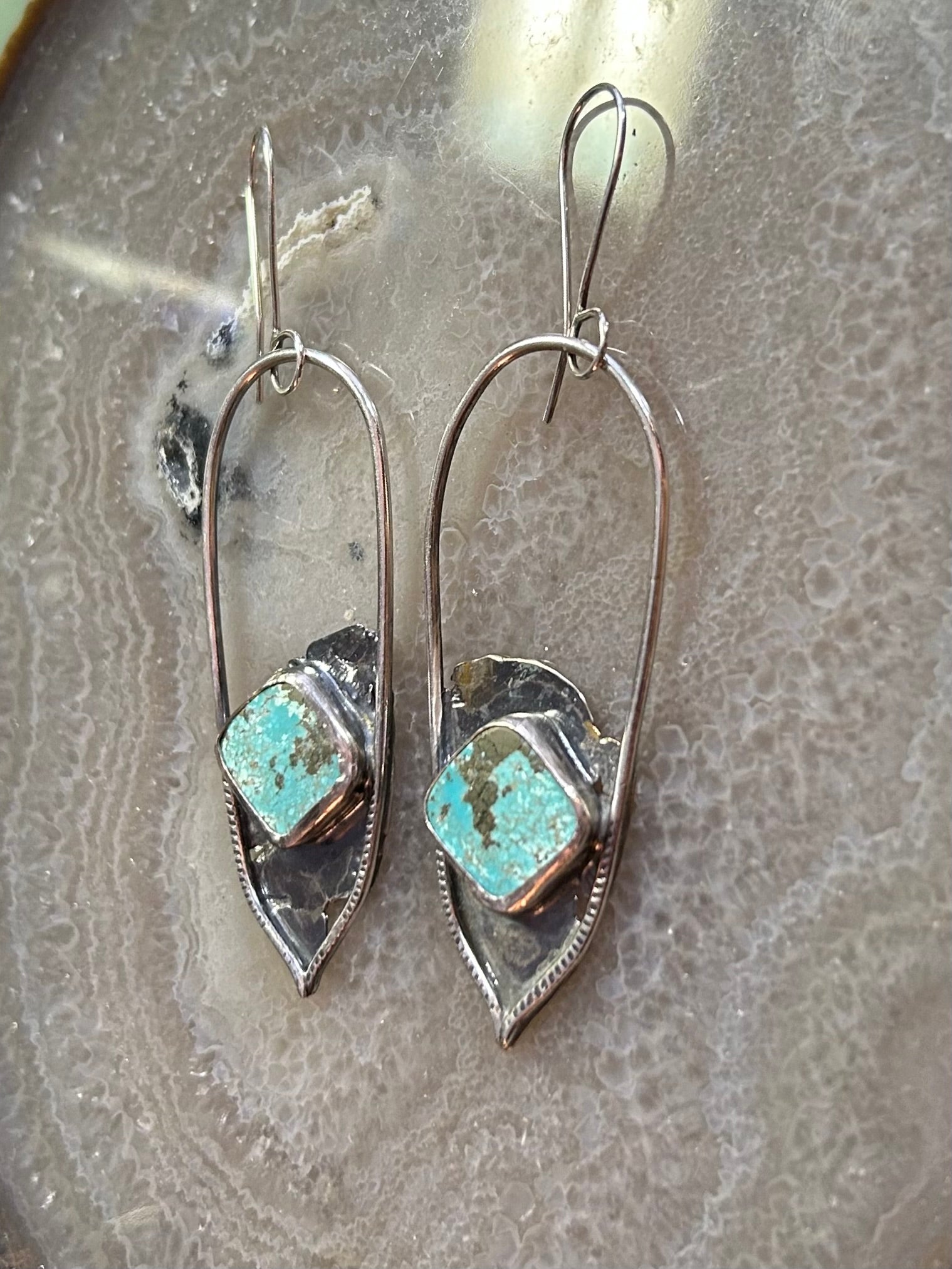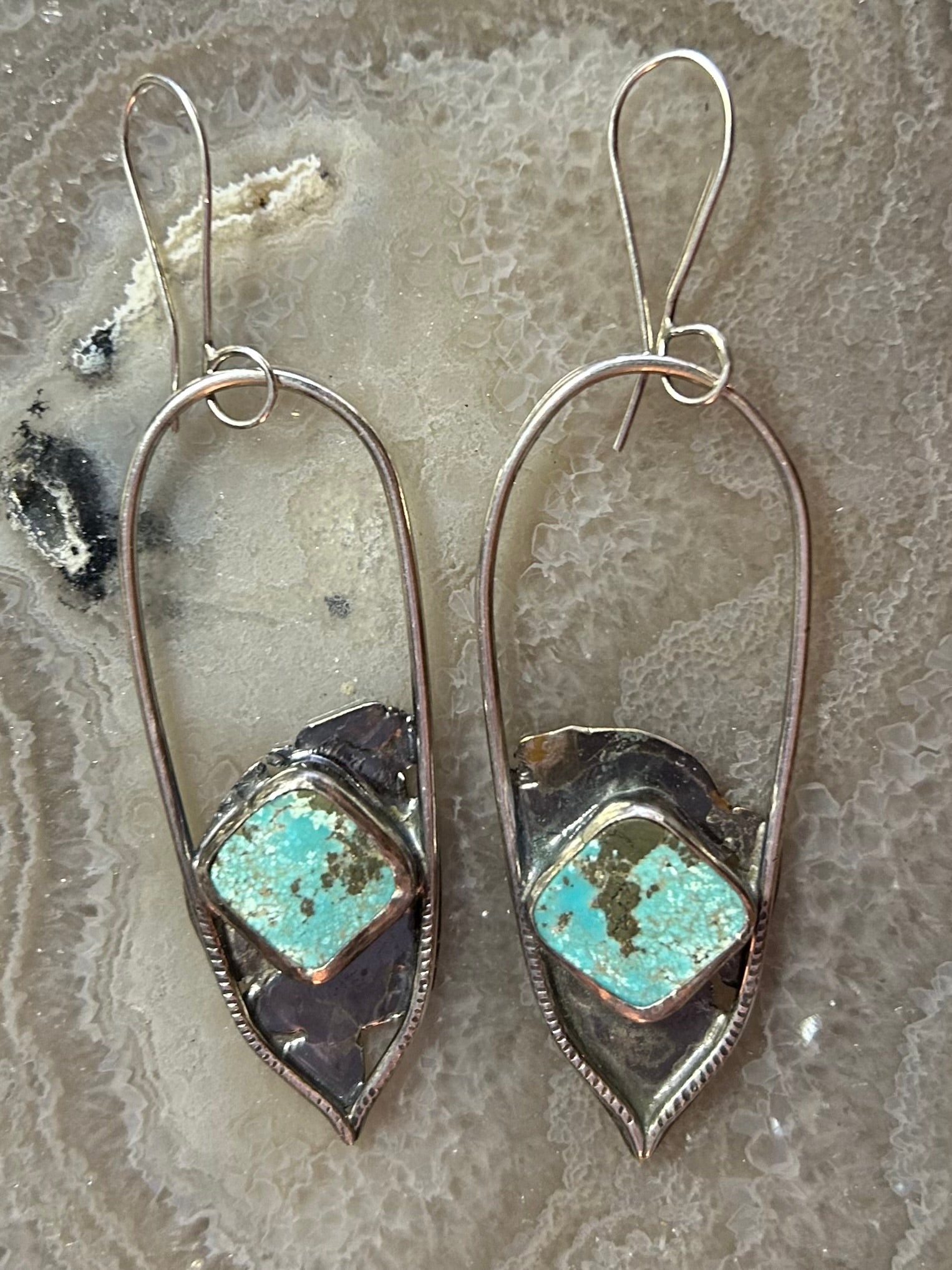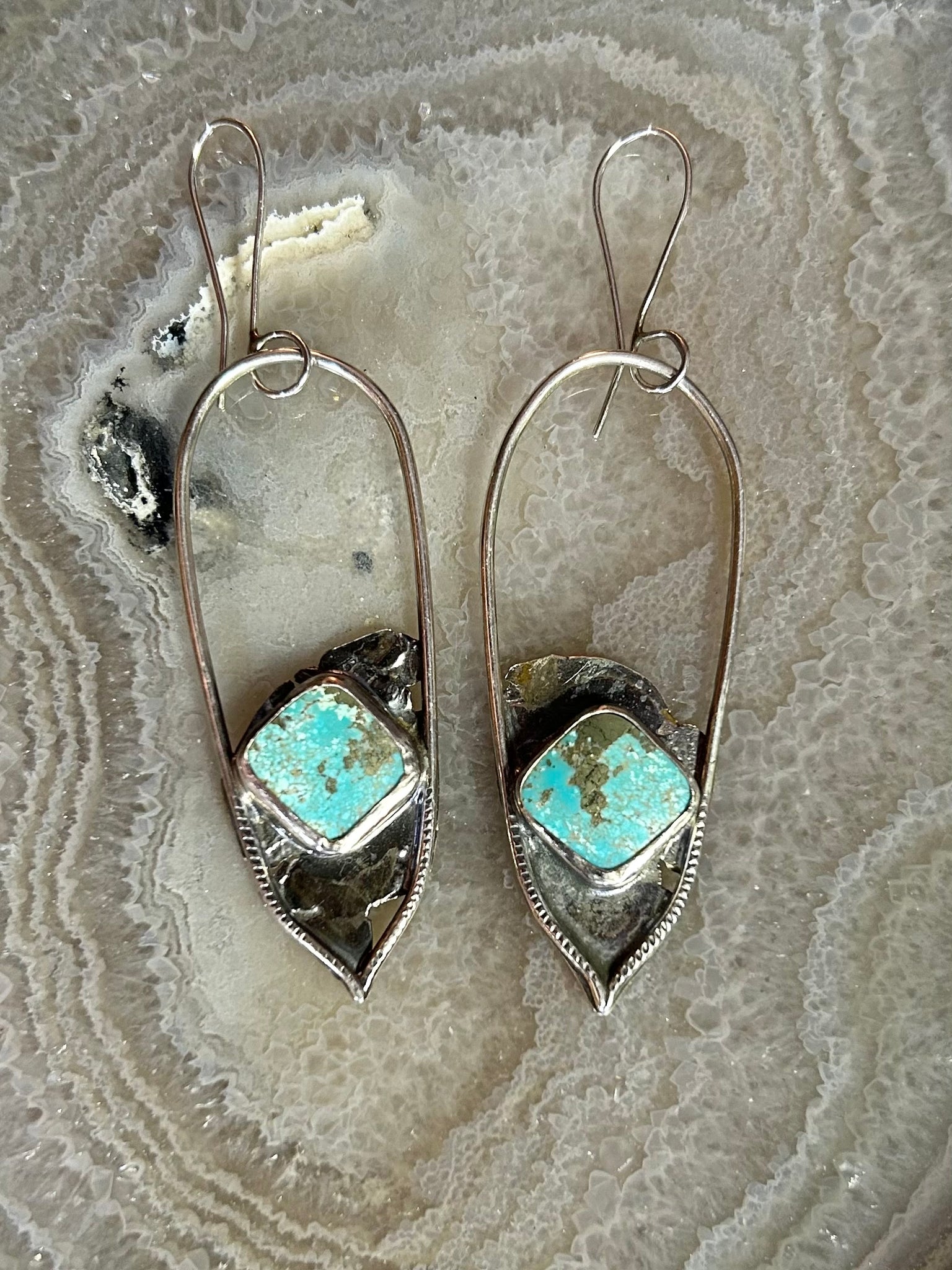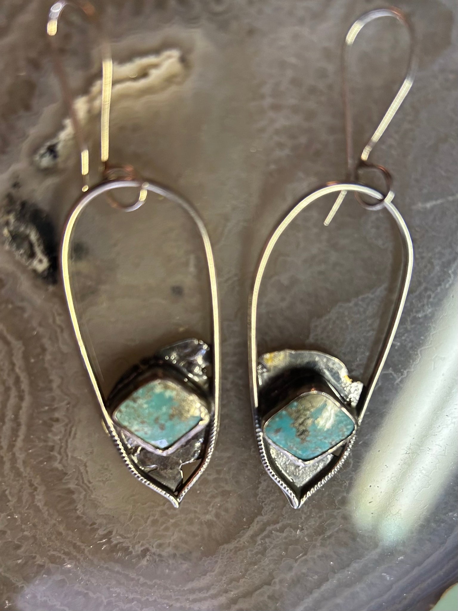 KINGMAN Turquoise gemstones set in one of kind recycled sterling silver and brass backs, with sterling silver hooks